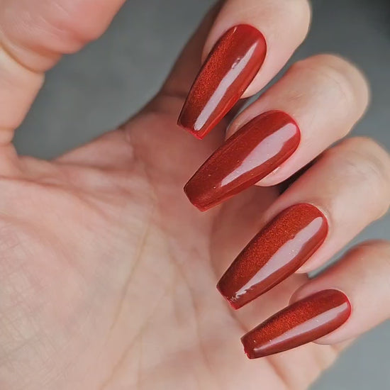 Offrez à vos mains une touche de mystère et d’élégance avec ces ongles press-on au sublime effet œil de chat. Leur finition rouge profonde capte la lumière et révèle un reflet lumineux unique, rappelant le regard hypnotique d’un chat.