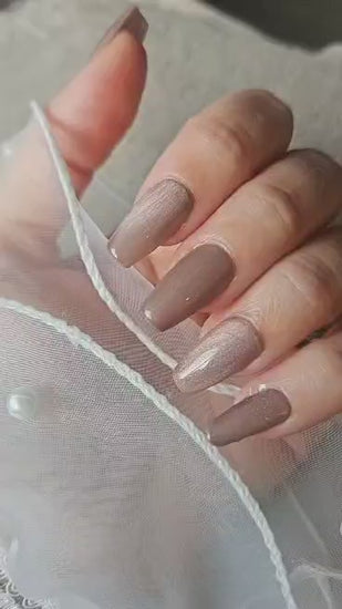Un marron profond et magnétique sublimé par l’effet cat eyes, qui capte la lumière comme un regard mystérieux. Des reflets chauds et élégants, rappelant les nuances des feuilles d’automne, pour une manucure à la fois raffinée et envoûtante.