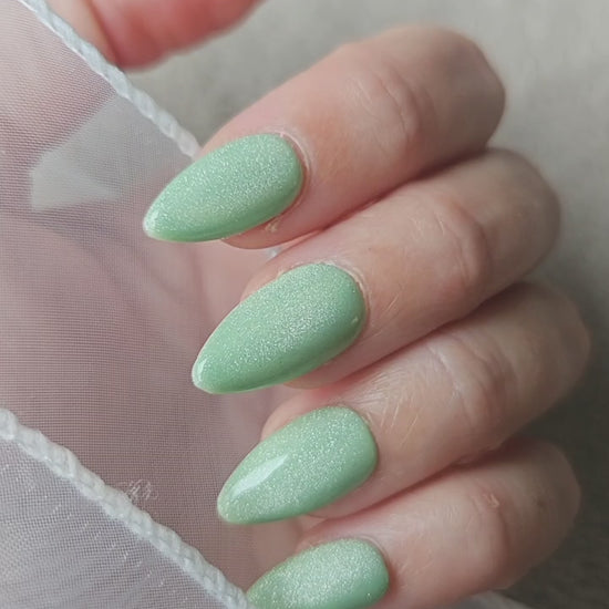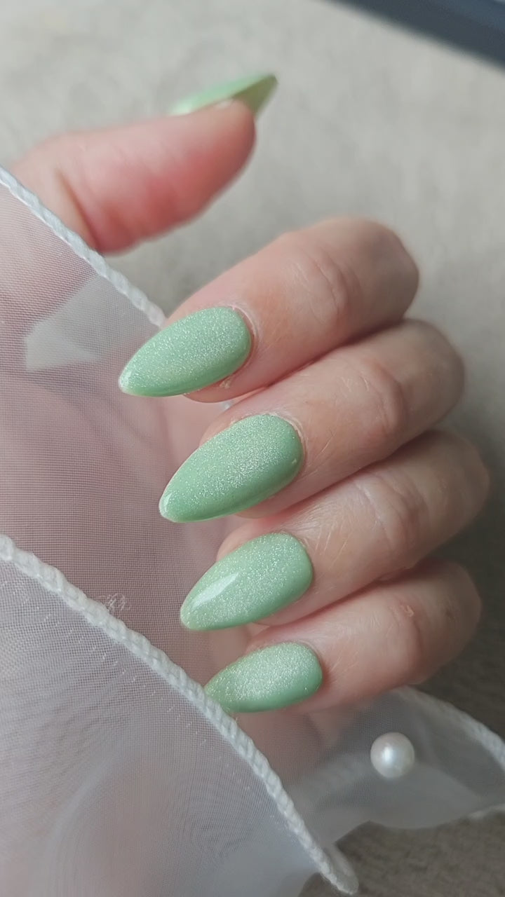 Laissez-vous captiver par l'effet cat eyes subtil et envoûtant de ce vert pâle nacré, qui capte la lumière avec une intensité mystérieuse.
